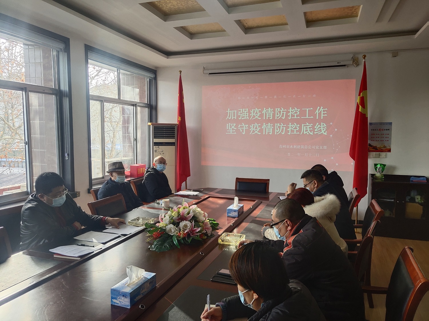 2021年1月12日,青州市水利建筑总公司召开专题会议,传达并落实青州市仁河水库运行维护中心《关于进一步做好当前疫情防控工作的通知》。会议由总经理何岗忠主持,公司经理层及各科室主任参加了会议。