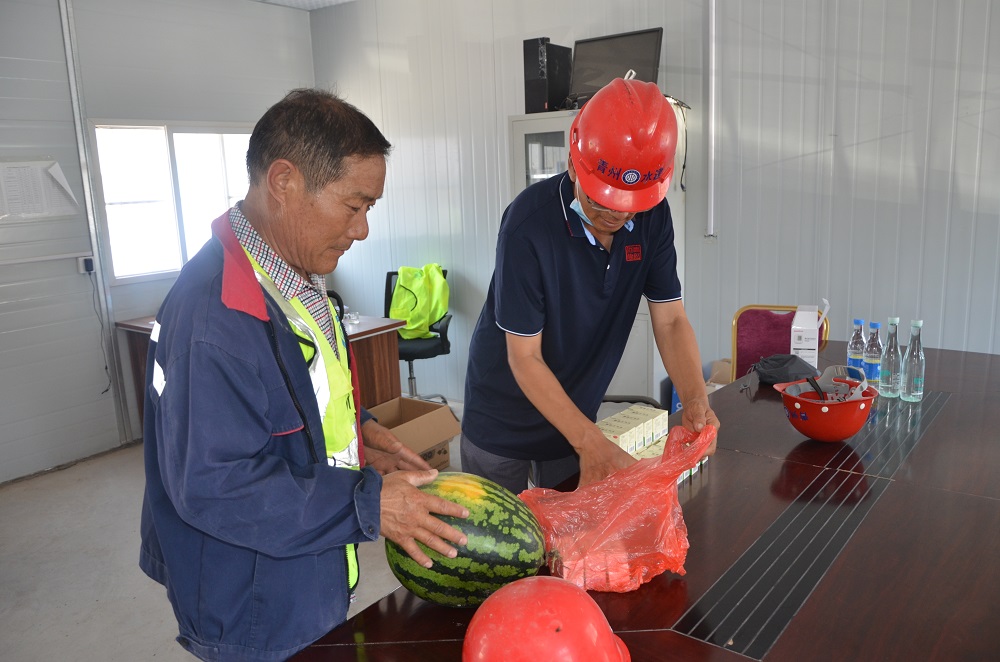 仪式结束后,何岗忠、张庆广、景信云等到山东省潍坊市青州市水利局张庄渡槽加固改造工程项目现场,为从事高温、户外作业的一线施工职工进行体检并送去了绿豆、西瓜、藿香正气水、矿泉水等防暑物品,感谢他们在炎热的天气默默坚守岗位,叮嘱他们在坚守岗位的同时注意防暑安全,适当休息、爱护身体,以更好的状态投入到工作中。同时强调项目部落实防暑降温主体责任,为一线职工提供必要的个体防护用品和高温作业休息场所,合理安排或调整作业时间,采取轮换班、轮休等方式,适当增加高温作业环境下职工休息时间,减轻劳动强度,保障职工安全。