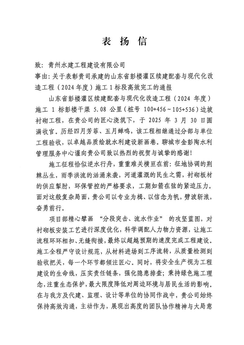 近日,公司收到聊城市金彭陶水利管理服务中心发来的表彰通报,对公司承建的山东省彭楼灌区续建配套与现代化改造工程(2024年度)施工1标段高效优质完工给予高度评价,并予以通报表扬。