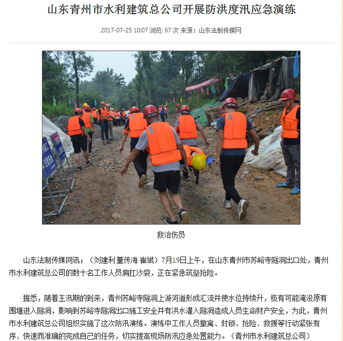 青州市水利建筑总公司为认真做好2017年防洪度汛工作,有效应对汛期可能发生的各类突发事件,检验、评价和保持公司生产安全事故应急救援预案的应急能力及有效性,评估公司应急准备状态,发现并修改《安全生产事故应急预案》和《安全生产事故应急处置方案》中的缺陷和不足。通过演练,进一步增强了员工防洪防汛意识和处置突发事件的快速反应能力,演练达到了预期效果,青州市水利局领导、监理公司及总公司领导,对此次演练给予了高度评价,认为演练具有较强的针对性和可操作性,切实提高现场防汛应急处置能力。
