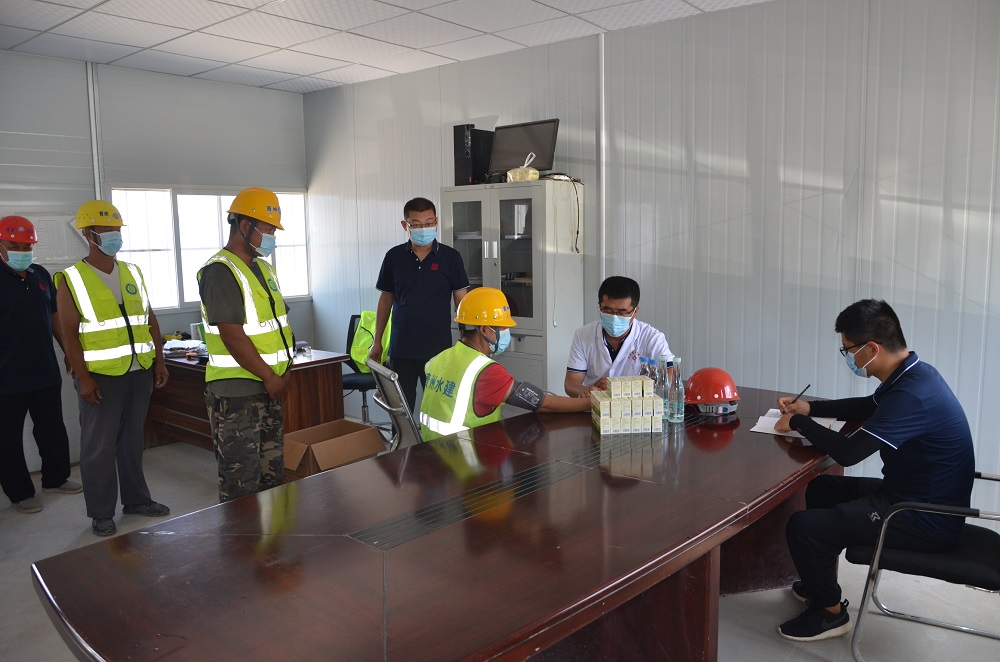 仪式结束后,何岗忠、张庆广、景信云等到山东省潍坊市青州市水利局张庄渡槽加固改造工程项目现场,为从事高温、户外作业的一线施工职工进行体检并送去了绿豆、西瓜、藿香正气水、矿泉水等防暑物品,感谢他们在炎热的天气默默坚守岗位,叮嘱他们在坚守岗位的同时注意防暑安全,适当休息、爱护身体,以更好的状态投入到工作中。同时强调项目部落实防暑降温主体责任,为一线职工提供必要的个体防护用品和高温作业休息场所,合理安排或调整作业时间,采取轮换班、轮休等方式,适当增加高温作业环境下职工休息时间,减轻劳动强度,保障职工安全。